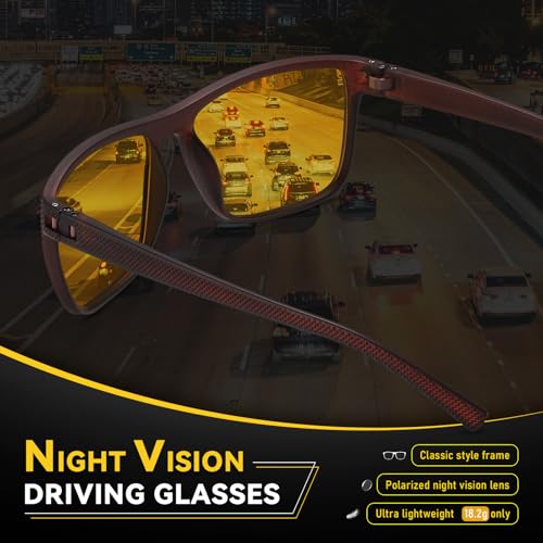 • HD NIGHT VISION POLARIZED LENS: HD polarized yellow lenses come with a special anti-reflective coating to effectively reduce glare from oncoming headlights and bright street lights, enhancing night vision performance and ensuring safe driving.