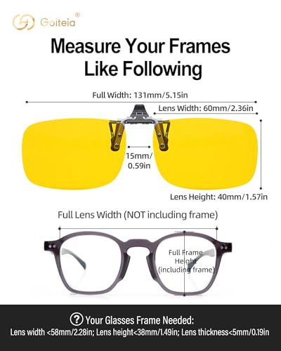 • 🌘【A Nice Choice for Night Driving】Goiteia clip on night driving glasses, international UKCA approved, which are designed for men or women to drive safer on cloudy,rainy,foggy days and at night.