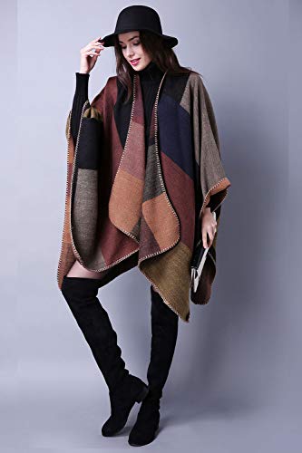KirGiabo Women's Plaid Sweater Poncho Cape Coat Open Front Blanket Shawls and Wraps 3