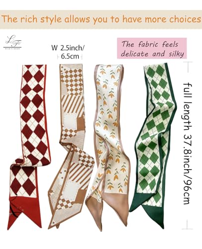 • 【size information】It measures 37.8(96cm) inches long and 2.6(6.5) inches wide,6 packs of different styles of scarves in just the right size to be used as handbag scarves, headband scarves, or women's scarf belts