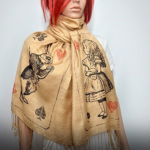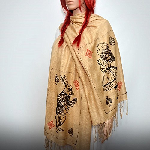 • Beige Shawl / Scarf with characters from the classic book by Lewis Carroll Alice in Wonderland - Alice and White Rabbit. Perfect gift for Alice in Wonderland lovers!