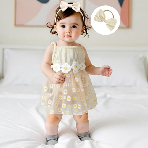 • Cute Design: Newborn Yellow dress.The baby girls’ tulle mesh romper is sleeveless, tie-up design, flower printed, tulle patchwork design, crotch buttons are convenient for diaper changing; Comes with a bow headband, fashionable and lovely