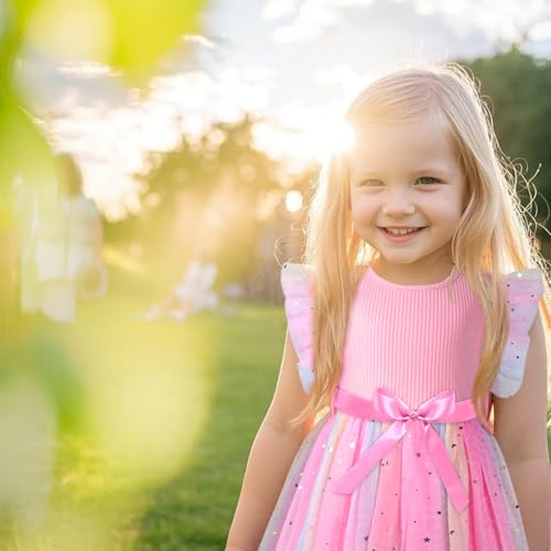 • Unique Mixed Color Design -- Unique mixed color birthday party dress capture the essence of fairy, classic crew neck layers dress with special rainbow color print. Ruffle shoulder & soft lining for toddlers. It looks especially sweet on summer. Every detail is designed for the kids, giving baby free space to grow up. Princesses with the dreamy and ethereal style of our girl's tulle dress.