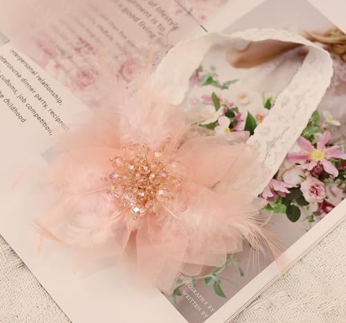 Bethynas Baby Girls Lace Feather Headband Beads Gauze Flower Elastic Toddler Hairband Birthday Party Princess Hair Accessories for Newborn Infant (Pink) 7