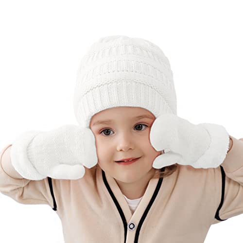 Muryobao Toddler Kids Girls Boys Knitted Winter Hat Gloves Set Warm Fleece Lined Skull Beanie Mittens Set Ages 1-6 Years 4