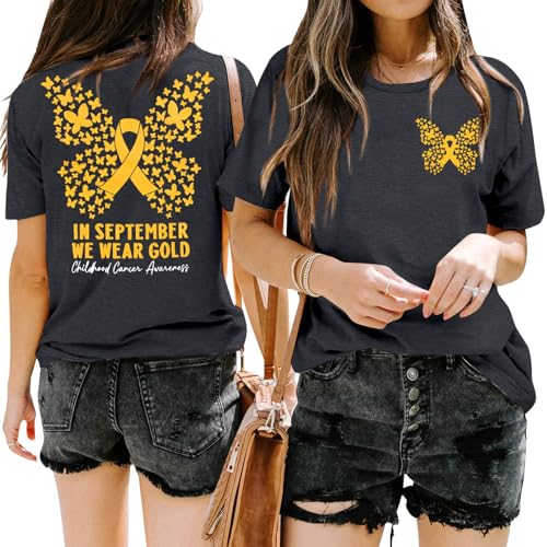 • MATCH: The In September We Wear Gold Childhood Cancer Awareness Ribbon T-Shirt is a good choice to match with your jeans, shorts, sneakers, boots, etc. Such a Butterfly print shirt will make you be more fashionable and attractive!
