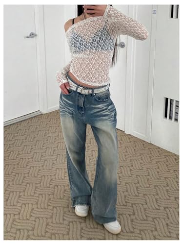More information about Milumia Women's Lace Sheer Mesh One Off The Shoulder Long Sleeve Crop Top Rave Y2k Sexy Shirt See Through Top