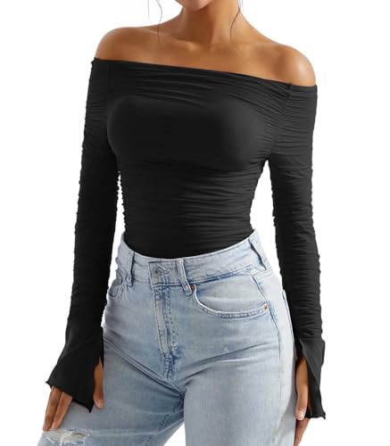 • Double Lined Tops: skin friendly double layer lace top long sleeve shirt, no see through, chic off the shoulder tops, tight fitted shirts design with ruched detail that enhances your silhouette