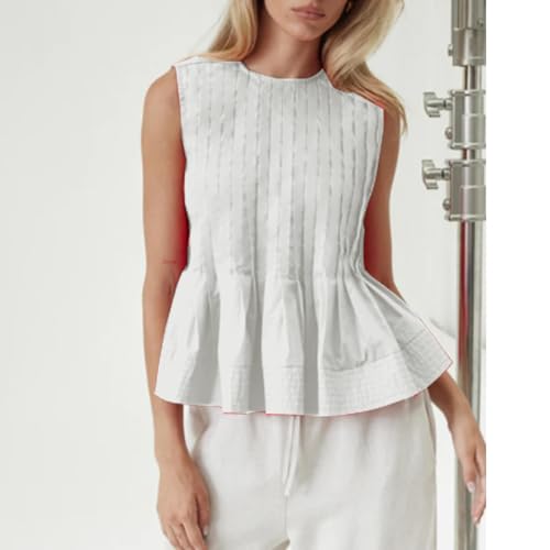 WOWULOVELY Womens Summer Pleated Peplum Sleeveless Blouse Tank Tops Crew Neck Babydoll Blouse Y2K Round Shirt 2025 2