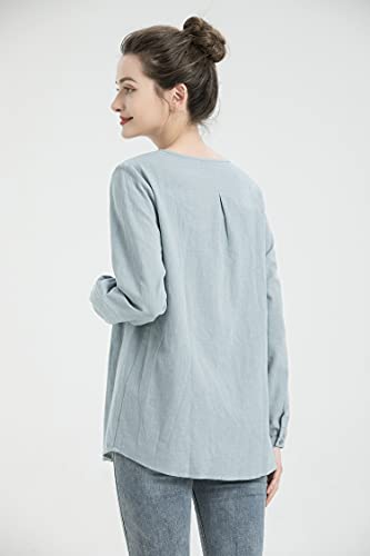 • new Solid color linen tops, linen blouse, button down shirts, long sleeve with round neck, front four button and pleated design, linen tops for women