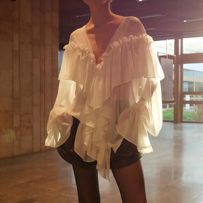 HOT ! Ruffle Blouse for Women Sexy Sheer Tie Front Chiffon Shirt Long Sleeve Loose Fit Flowy Coquette Top Streetwear