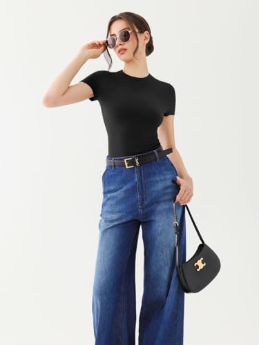 HOT ! REORIA Women's Crew Neck Short Sleeve Tops Double Lined Slim Fit T Shirts Basic Tee