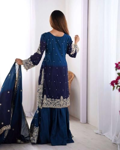 UNIQUE CRAFT MDWomen's Chinon Silk Sequence With Rivet Moti Work Straight Kurta With Sharara and Dupatta Set 4