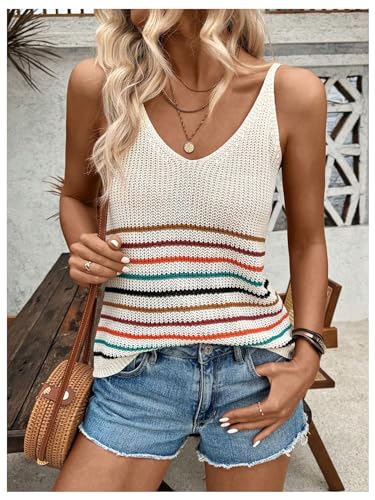 HOT ! SweatyRocks Women's Colorful Striped V Neck Knitted Cami Tops Sleeveless Spaghetti Strap Tank Tops
