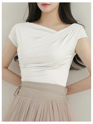 HOT ! OYOANGLE Women's Asymmetrical Neck Short Sleeve T-Shirts Ruched Tight Shirts