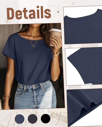HOT ! Huukeay 3 Pack Boat Neck Tops for Women, Short Sleeve Loose Cotton Shirts Causal Oversized Tunic Basic Tees Off The Shoulder