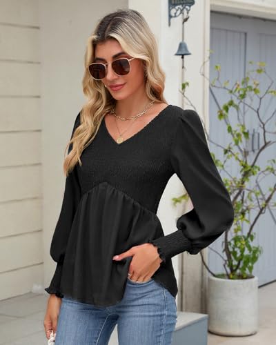HEYTALALA Womens Long Sleeve Shirts V Neck Peplum Tops Dressy Casual Smocked Babydoll Blouses 2025 Fall Trendy Outfits 2