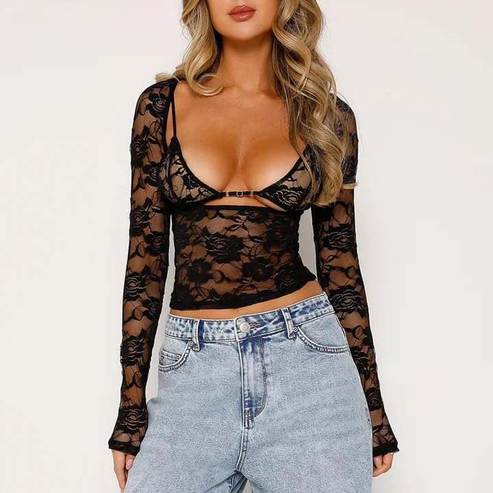 • Trendy Design: Delicate floral lace pattern, sheer, plunging cut, long sleeves, cropped length. Lace tops for women, cropped T-shirts for women, matching bra, slim fit, stylish and unique streetwear designs to make you more attractive force