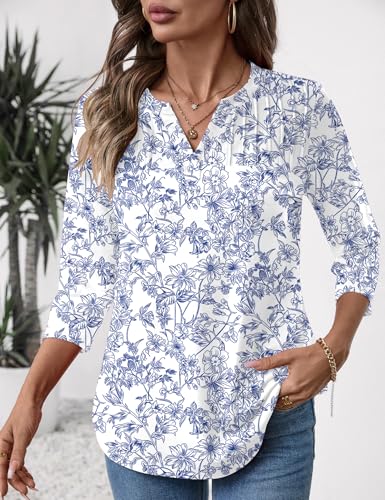 LOMON Women's 3/4 Length Sleeve Tops V Neck Dressy Casual Blouses Fashion Pleated Tunic Shirts Summer Fall 2025 3