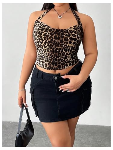 WDIRARA Women's Plus Size Leopard Print Ruched Halter Crop Tops Cowl Neck Tie Back Sleeveless Cami Tops 6