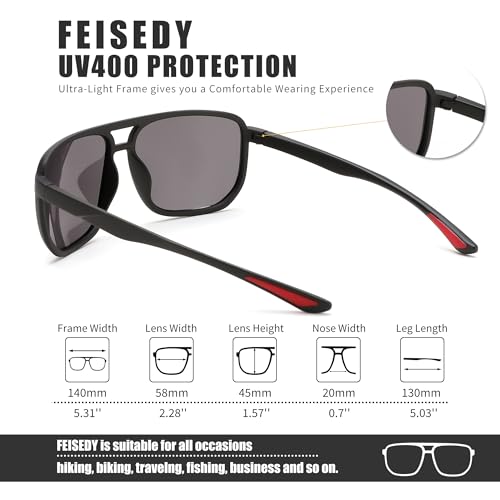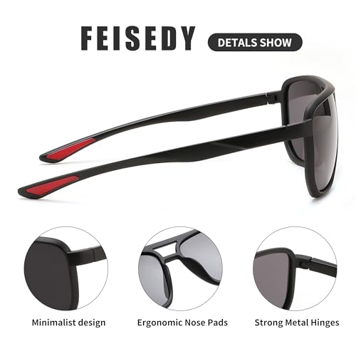 • 【Polarized Lenses】High Definition Polarized Lenses: In order to prevent UV damage to your eyes, all polarized lenses of FEISEDY men's sunglasses are made of high quality polarized lenses with UV400 protection. You can move freely under the sun without worrying about UVA, UVB and glare damage to your eyes.FEISEDY men's polarized sunglasses restore the true colors of the world, making them clearer and softer.