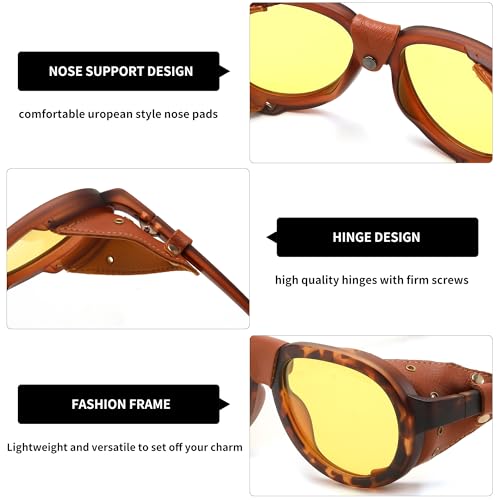 FEISEDY Steampunk Sunglasses Women Men,Polarized Yellow Lens, Retro Round Vintage Frame Leatherwear B0159 7