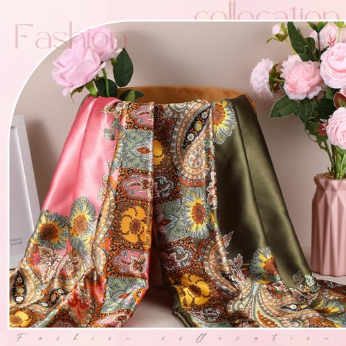 SATINIOR 35 Inch Silky Head Scarf 2 Pcs Large Square Neck Scarf Sleeping Hair Wrapping Satin Bandana for Women(Pink, Green,Retro Style) 6