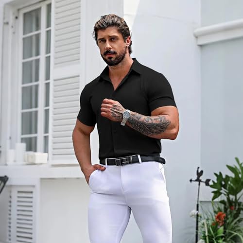 • Fashionable Design: This mens shirts short sleeve strikes the perfect balance between formal and casual. It features a classic solid color and a slim fit silhouette that accentuates your physique without being too tight. The turndown collar and button-up closure add a touch of sophistication, while the short sleeves give it a laid-back vibe. Whether you're attending a business meeting or grabbing drinks with friends, this shirt is sure to enhance your confidence and attractiveness.