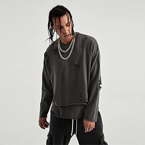 HOT ! Vintage Streetwear ripped Sweatshirt Men Fashion Autumn Solid Color Oversize Sweatshirt
