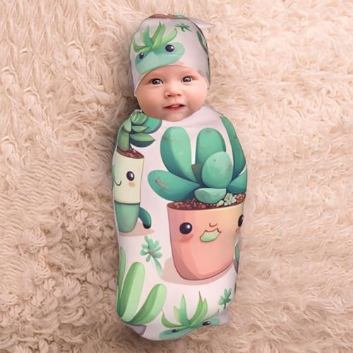 Lovely Succulent Plants Print Newborn Swaddle Blanket with Beanie Set, Soft Baby Sleep Sack Receiving Wraps, for Boy Girl 1