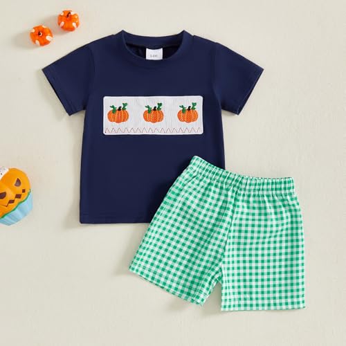 HOT ! Toddler Baby Boy Halloween Clothes Pumpkin Embroidery Smocked Short Sleeve T-Shirt and Plaid Shorts Set Fall Outfits