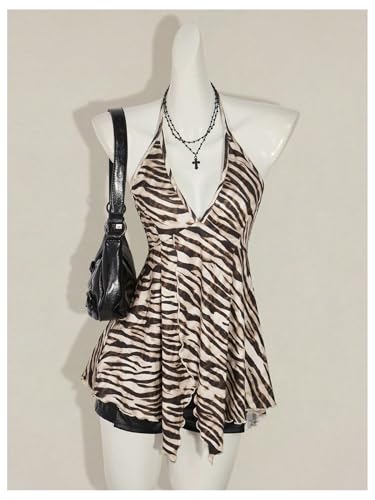 HOT ! MakeMeChic Women's Halter Tops Zebra Print Backless Deep V Neck Summer Flowy Camisole Top