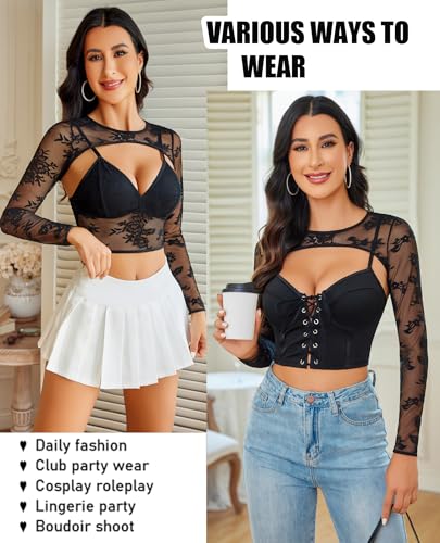 • Design:This shrug crop set includes lace crop top and a lace shrug shoulder top that can be mixed and matched to create different looks that suit your style.You can also match this lace shrug top with a lace bralette, tank, camisole, or bra for a club-ready outfit or a more casual look.