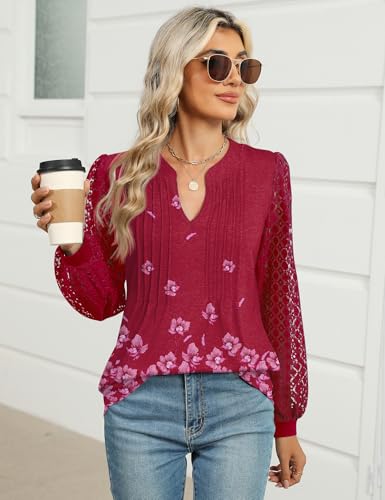 Micoson Womens Lace Long Sleeve Tops V Neck Pleated Blouses Dressy Casual Work Shirts 2