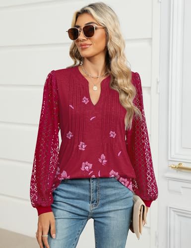 Micoson Womens Lace Long Sleeve Tops V Neck Pleated Blouses Dressy Casual Work Shirts 5