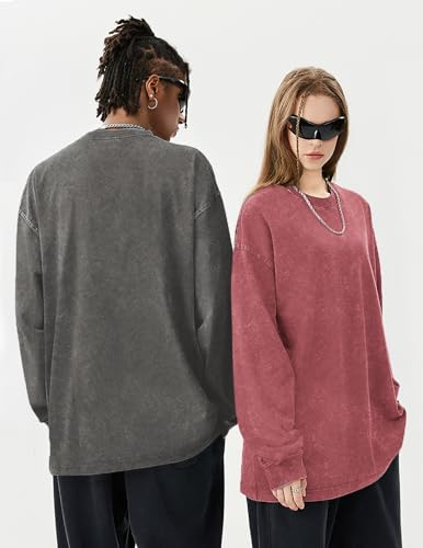 Oversized Tshirts for Women Heavy Cotton Acid Wash Vintage Unisex Long Sleeve Casual Loose Solid Basic Tee Tops 5