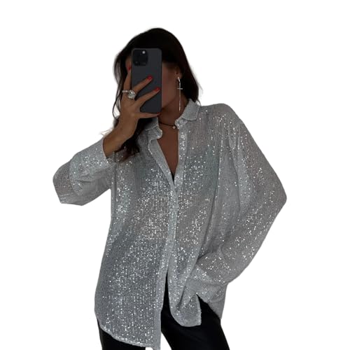 More information about AMPOSSTO Womens Sequins Long Sleeve Collared Shirt Button Down Open Front Shirt Loose Blouses Shirst Tops