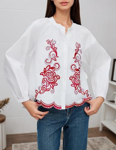 • Design:Featuring long sleeve, v-neck, floral embroidered, drop shoulder, scalloped hem, this embroidered blouse is so fashionable, the embroidered flower on the top is so exquisite and very eye-catching
