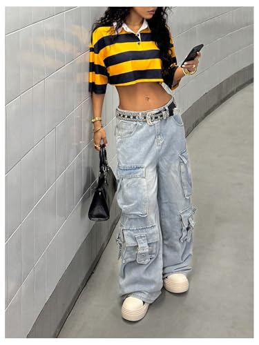 More information about Milumia Women's Y2k Striped Button Up Collared T Shirt Short Sleeve Drop Shoulder Crop Tops
