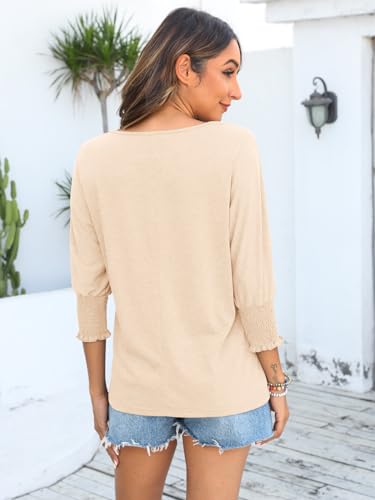 • Features: The best part of the changing season is put on our 3/4 sleeve tops! Stretchy knit this effortless shirt that has flattering scoop neckline and a 3/4 dolman sleeves with wide smocked cuffs.Relaxed bodice continues down to rounded hems. Exposed seam details at the smocked cuffs an edgy finish to this essential look.