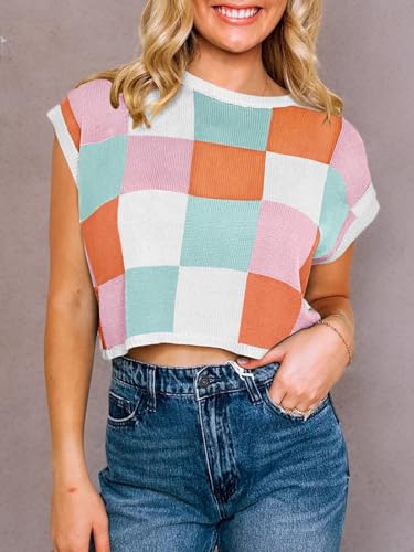 Saodimallsu Womens Cap Sleeve Crop Tops Summer Color Block Going Out Crew Neck Knit Trendy Casual Sweater 1