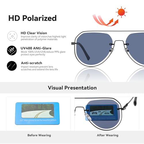 • 【UV400 TAC POLARIZED LENSES】 KIOYTLIK's HD aviator polarized sunglasses can block 100% of harmful UVA, UVB & UVC rays and filter out sunlight reflection glare effectively to protect your eyes perfectly all year round. As every buyer's face is big or little, please check the size of the picture of square aviator sunglasses description carefully.