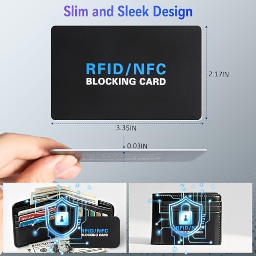 • 2 Effective protection; Our RFID-blocking card, compatible with all standard-sized cards, utilizes the latest 13.56 MHz RFID/NFC technology. It emits a jamming signal that disrupts radio frequency signals within a 2.4-inch range (1.2 inches on each side), efficiently secure your entire financial and identity information