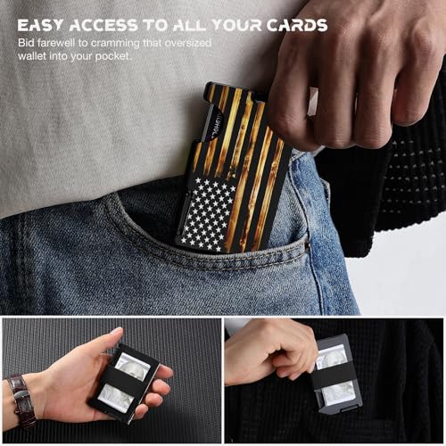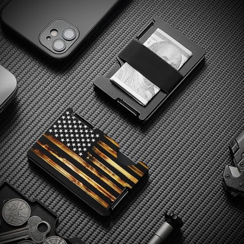 HOT ! Minimalist Metal Wallet for Men, Ultra-Thin Aluminum Card Holder with Cash Strap, Personalized Wood American Flag, Slim Front Pocket RFID Blocking Wallet