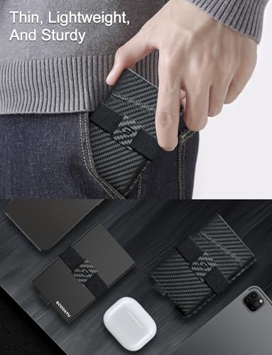 • 【Quick Access to Cards & Large Capacity】Our slim wallet for men can hold up to 14 cards in total - Aluminium card case holds 5-6, depends on the number of embossed cards. Removable leather case can hold up to 2 cards. The elastic band allows you to hold 6 cards, 10+ bills or receipts. The minimalist wallet features built-in ejection mechanism, the cards in the card case pop up at a step pattern with the flip of a finger. Access your essentials in seconds, and look good doing it, easy and portable