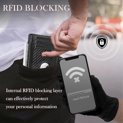 • AirTag-Compatible Wallet with Integrated Holder: Crafted from premium carbon fiber, this slim airtag wallet features a built-in holder designed for your AirTag. By placing your AirTag within the dedicated holder, you can ensure both the protection of your AirTag and the ability to keep track of your air tag wallet. Bid farewell to the worry of misplacing your wallet – with this innovative design, your wallet and AirTag will stay connected.