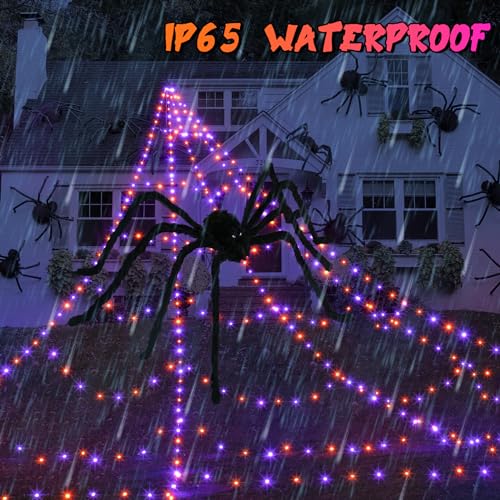 Halloween Spider Web Lights Decoration 455 LED Spider Webs Halloween Decorations Outdoor with 59" Large Spider & 3.53 oz Stretch Cobweb 16.4 Ft Light Up Giant Spider Web (Purple & Orange) 6