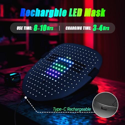 • Type-C Charging – Led mask uses high light 234 lamp beads and 3535 rgb led lamp beads. first use need charging time for 3-4 hours (Ps: USB TYPE-C CHARGING: 5V/1A plug),can be used for about 8-10 hours,electronic digital masks do not worry about battery consumption,led mask very quiet at work,no harm to the body.