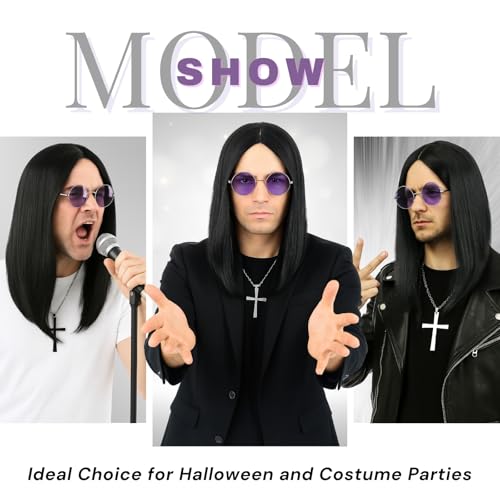 HOT ! morvally Long Black Straight 80s Heavy Metal Rocker Wig for Men - Center Parting Natural Synthetic Hair Wigs Including Cross Necklace and Glasses for Halloween Costume (Black)