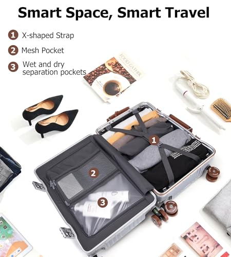 • Durable Hard Shell Carry On Luggage: This PC carry on suitcase features a PC+ABS hard shell with a robust aluminum frame, our rolling carry on luggage for planis fortified against scratches for added resilience on your journeys. Top and side soft leather handles provide comfort and style.